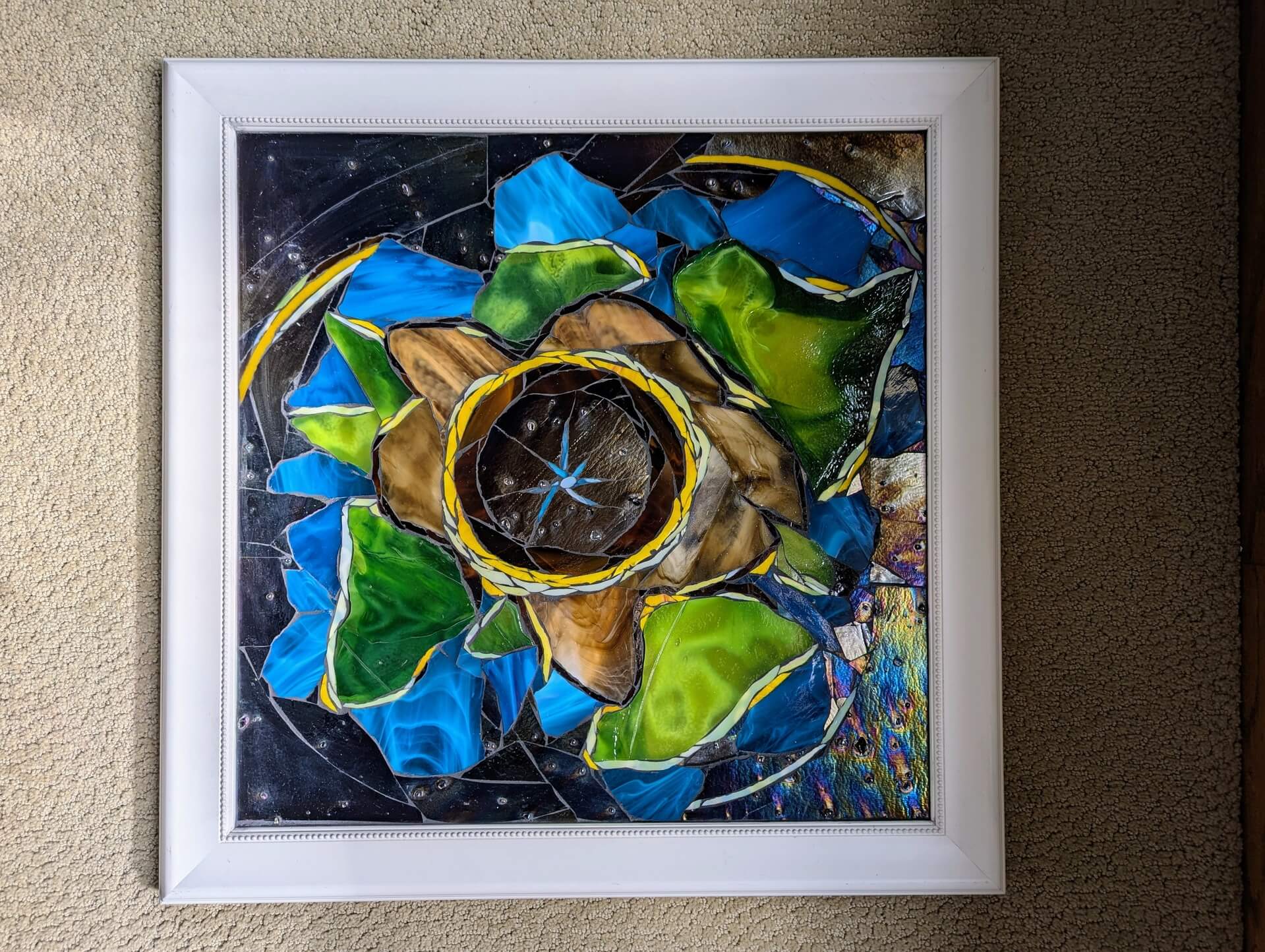 Minnesota-based artist Kristin Dieng has been developing her skills as a glass artist for the last decade. When a chronic illness forced Kristin to leave a previous career, Kristin sought out a new way of interacting with the world and found mosaic art. Kristin’s art explores the way in which light-filled art can serve as a source of healing. While she specializes in brightly colored nature-themed work and complex geometric patterns, Kristin finds particular joy in creating artwork that is interactive with both its viewer and its environment. Kristin is known for challenging people’s expectations about what constitutes stained glass art, experimenting with out-of-the-box techniques such as layering glass and incorporating unexpected mixed media materials into her designs. Kristin’s work has been exhibited in galleries throughout MN and WI.