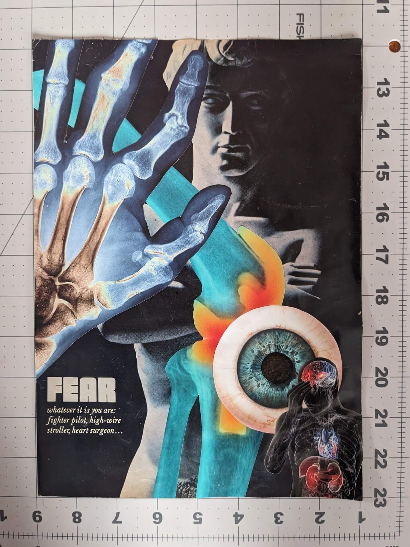 Bella Tabor is a visual artist whose work emerges from a lifelong relationship with disability and a commitment to reimagining how the body and mind communicate. Living with a full‑body connective tissue disorder, Bella found art as a vital bridge when words were no longer sufficient, offering a way to translate sensation, memory, and emotion into form. A Courage Kenny alum, Bella participated in the Chronic Pain Rehabilitation Program in 2024, an experience that further shaped artistic direction. Pain in the hands has made handwriting difficult, but using scissors as an extension of the body opened new freedom through cut‑and‑paste collage. Bella works with images, text, and visual material drawn from the recent and distant past, sourcing widely circulated publications to dismantle and reassemble familiar narratives. Through recontextualizing imagery and language, the work challenges inherited ideas and biases, transforming media once meant for consumption into layered compositions defined instead by agency, care, and self‑expression.