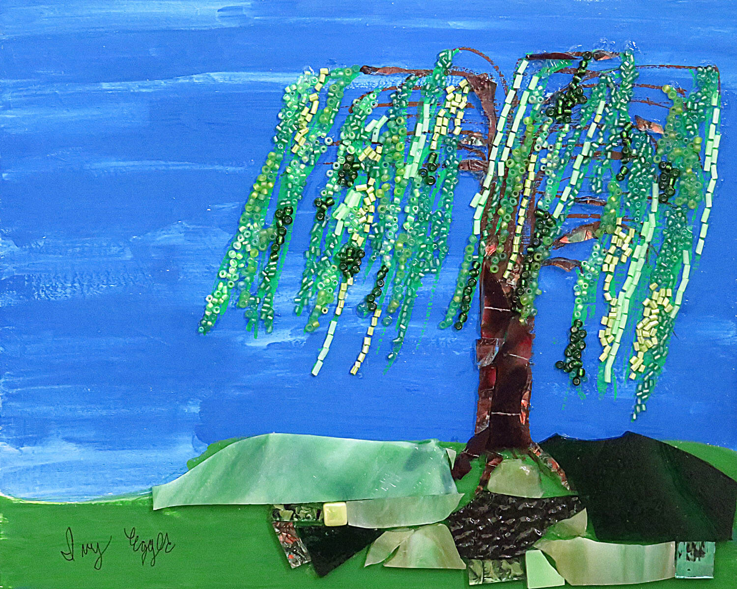 "Ivy Egger works primarily in mixed media mosaic, incorporating pieces of cut glass, beads, mica, glitter, and anything else that adds sparkle to her art form. She has a disability that began at birth due to a rare liver disease, and her inspiration comes from her desire to cope more effectively with her illness. Beginning her mosaics with a simple acrylic or gouache painting provides a foundation for her work. Mosaics give her the opportunity to transform broken pieces of glass into a new creation. Since mosaics require a sturdy surface, she creates them on canvas or cradled wood panels. Unlike traditional mosaic techniques, Ivy uses glue to adhere beads, glass pieces, mica, and other materials to the panels, allowing them to add extra sparkle to her art. Her art practice stands in direct contrast to her rigid day job. The dreamlike quality of her work represents freedom—freedom to create without constraints—and brings a sense of hope and beauty to her audience." Website: www.vinedesignsart.com
