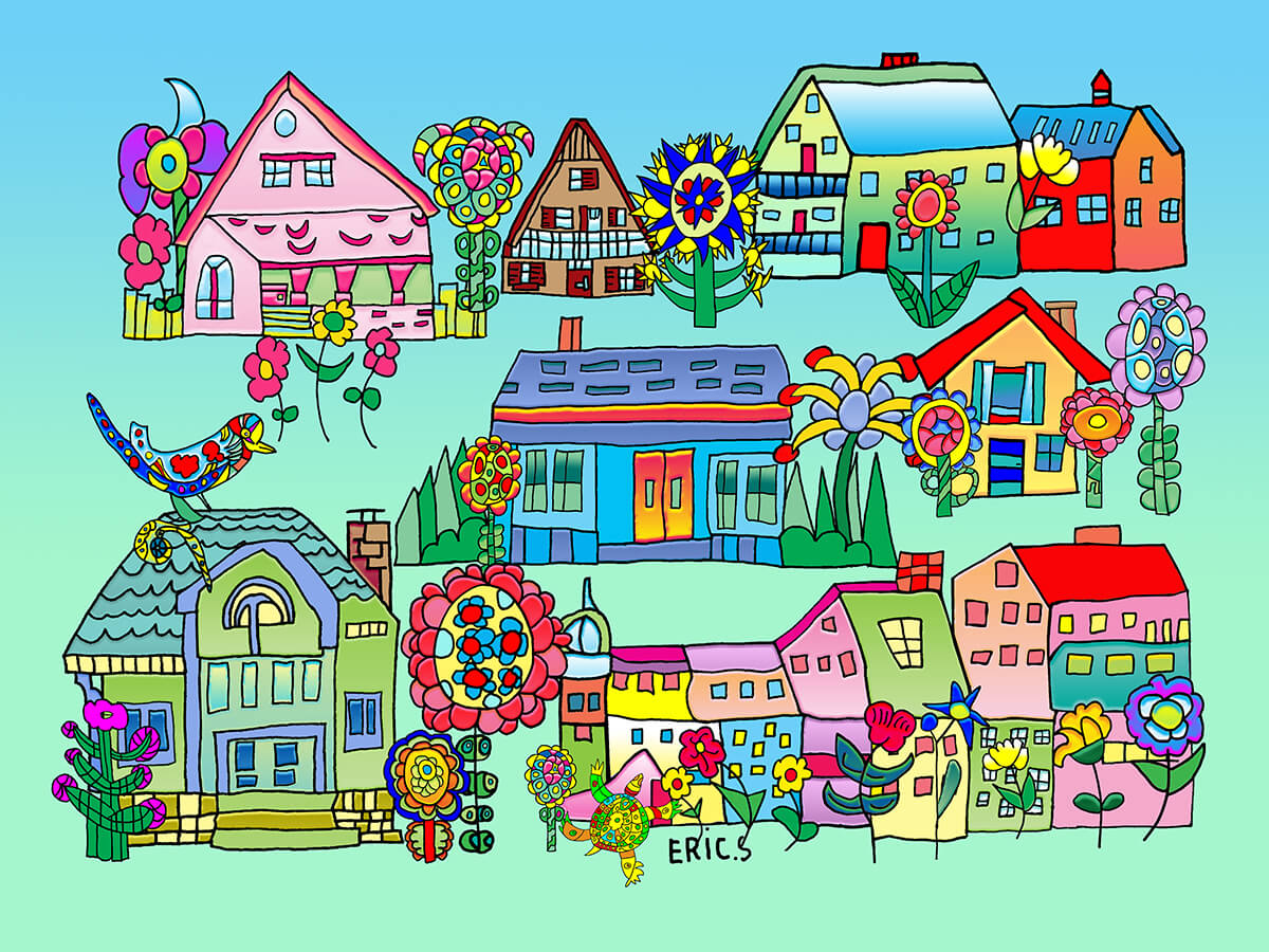 Eric Sherarts began making art as a child and never stopped. Art is part of daily life and part of who Eric is, offering a language for expressing ideas, deep feelings, and lived experience. Through mixed media, drawing, painting, digital art, and mosaic, Eric weaves imagination and an understanding of the world into work that is rich with strong, expressive color. Recent pieces begin with hand‑drawn images, later transformed in a digital studio to build vibrant scenes filled with flowers, homes, letters, and playful forms. These whimsical shapes invite viewers to imagine places where creativity and joy are always present. Eric has Down syndrome, but it does not define him. Eric is an artist and a Special Olympics bocce champion. When creating, Eric feels beautiful inside and out, always striving to make meaningful work for others to see.