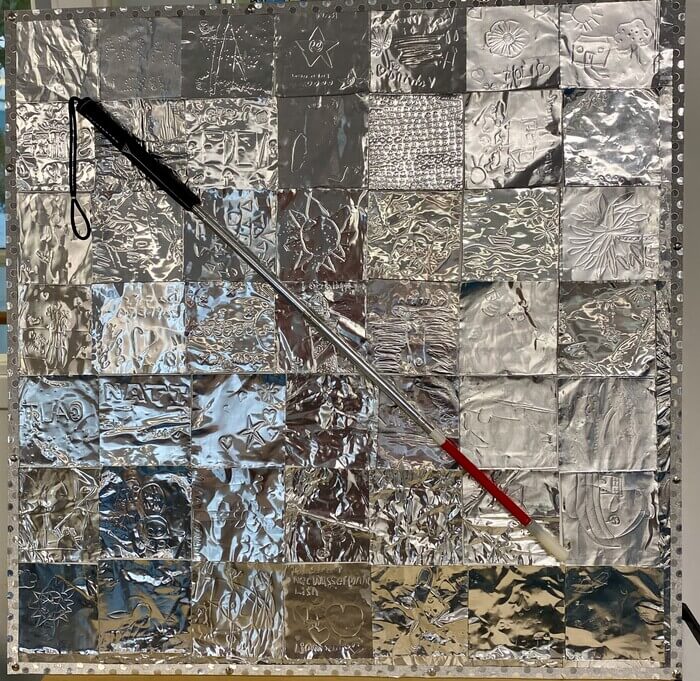 This collaborative artwork led by Aaron Hill was created to invite reflection beyond sight alone. Designed as a tactile, quilt‑like surface, the piece encourages engagement through touch, texture, and shared experience. Created with intention and care, the work centers on awareness, connection, and the belief that creativity is accessible in many forms. Each section contributes to a larger whole, demonstrating how individual marks build something collective and meaningful. The artwork challenges expectations about how art is experienced, emphasizing presence rather than perfection. Through texture and form, the piece offers a welcoming invitation for viewers to engage with their hands, imagination, and curiosity. It stands as a celebration of creativity that extends beyond traditional boundaries, showing that art can be experienced, shared, and felt in many ways.